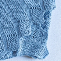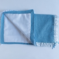 Conjunto faldón de lana azul con tela de lacitos, capota y patucos