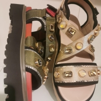 Sandalia de tiras en beige y en verde. detalle de adornos en cristales. muy cómoda. tallas sueltas 36/41